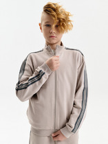 Толстовка прямого силуэта. Горловина округлой формы с воротником стойкой из основного полотна. Рукава втачные длинные. Линия плеча слегка спущена. По низу рукавов отрезные манжеты. Центральная застежка на тесьму молнию. По низу джемпера отрезной пояс из рибаны