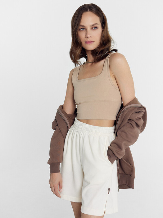 Топ облегающего силуэта с широкими бретелями. Изготовлен из трикотажной кулирки. Вырез горловины – «каре». По нижнему срезу проходит широкий пояс из основного полотна. Бретели и горловина окантованы бейкой из основного полотна. Рекомендуем!