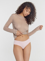 Трусы женские, средняя линия  талии, силуэт - бразилиано. Передняя и задние детали выполнены из сетки. Подкладка ластовицы из хлопка, верхний срез подкладки ластовицы отлетной. По верхнему срезу трусов и по ножкам рюша из сборки, под низом жилка.