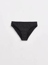 Трусы женские, средняя линия  талии, силуэт - бразилиано. Передняя и задняя детали выполнены из рибаны. Верхний срез трусов обработан бейкой поперечной из рибаны, внутри жилка 6мм. Нижние срезы обработаны бейками поперечными из рибаны. Подкладка ластовицы из хлопка, верхний срез ластовицы притачан к детали из рибаны (с изнаночной стороны имитация мужского гульфика, с лицевой стороны декоративные строчки).
