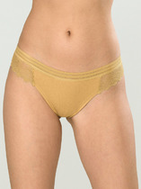 Передняя и задняя детали выполнены из микрофибры. Ластовица из кулирной глади отлетная по переднему срезу. По талии жилка тканая настрочена на п/ш с узким межигольным расстоянием.