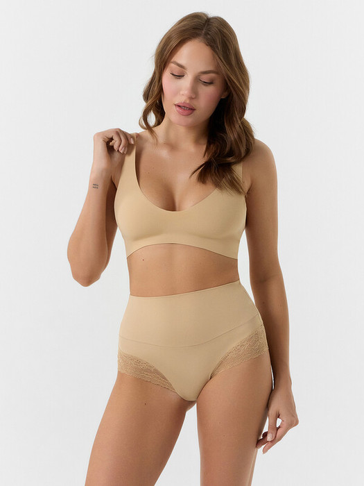 Трусы женские корректирующие с высокой посадкой, из эластичного кружева и трикотажного полотна микрофибры.  Верхние детали из микрофибры соединены между собой ширителем, нижние детали из кружева. Верхняя часть двойная, со сгибом по талии.  Подкладка ластовицы выполнена из кулирного полотна, отлетная по переднему краю. По срезам ластовицы жилка 6мм. внутри (WT4-6).