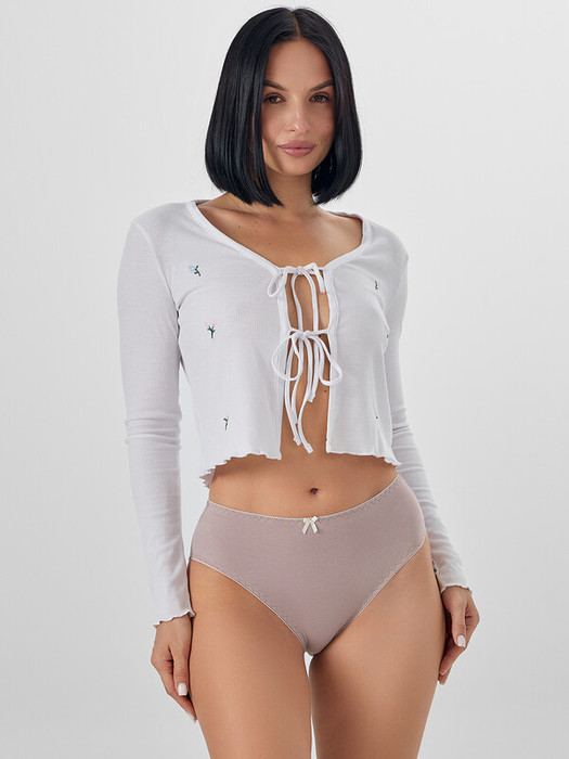 Украшением модели служит изящный декоративный элемент — бантик, расположенный по центру передней детали. Подкладка ластовицы из основного материала обеспечивает дополнительный комфорт и гигиеничность. Благодаря составу с добавлением эластана трусы сохраняют форму после стирок и мягко облегают фигуру. Эта модель станет прекрасным дополнением вашей коллекции нижнего белья, сочетая в себе практичность и нежный дизайн.