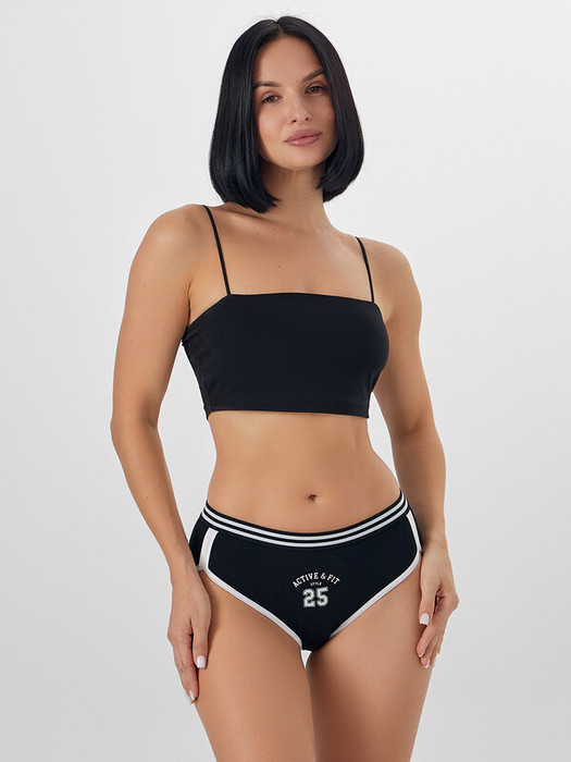 Передняя деталь цельная, окантована по ножкам переда и спинки бейкой из основного полотна на плоскошовной машине. Нижняя ластовица отлетная по переднему срезу, выполнена из основного полотна. По талии тесьма эл 25мм (жаккард JT19-25, УЗБ Sedat MF D-1) настрочена на плоскошовной машине.