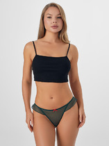 Трусы женские, силуэт, бразилиана, выполнены из кружевного полотна. Рюша по бокам переходящая на спинку. Подкладка ластовицы из кулирного полотна, отлетная по  верхнему срезу. Верхний срез обработан  эл тесьмой 8мм ( с зубом KTE5-8 Arteks E2699 ).Задняя деталь с центральным швом. По ножкам передней и задней детали эл тесьма 6мм (жилка Wt4-6, девсел 13460W) обработана зигзагообразной строчкой. Край рюши обработан закруткой.