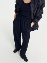 Брюки изготовлены из трикотажного полотна футер. Брюки прямые с высокой посадкой. Пояс отрезной из рибаны с эластичной тесьмой внутри. В передней части пояса с лицевой стороны пробиты петли и втянут шнур. Шов втачивания пояса распошит. Спереди обработаны карманы хулиганы. По низу брюк отрезные манжеты из рибаны.