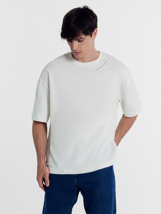 Футболка прямая свободная. Горловина округлой формы обработана обтачкой из рибаны. Линия плеча слегка спущена. Рукава втачные, корткие. Нижние срезы футболки и рукавов обработаны швом вподгибку на 2х шовной плоскошовной машине.