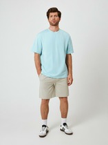 Футболка прямая свободная. Горловина округлой формы обработана обтачкой из рибаны. Шов втачивания обтачки по спинке закрыт бейкой из основного полотна. Линия плеча слегка спущена. Рукава втачные, корткие. Нижние срезы футболки и рукавов обработаны швом вподгибку на 2х шовной плоскошовной машине.