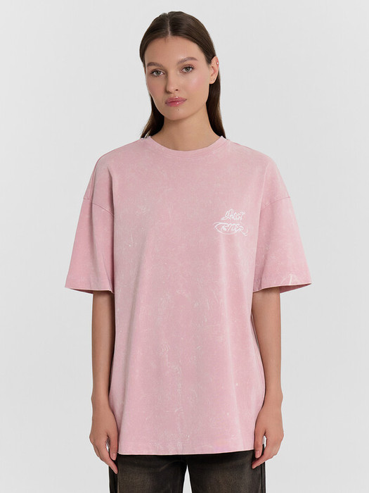 Футболка силуэта оверсайз из трикотажного полотна кулирка. Горловина круглой формы, обтачка горловины из рибаны. Шов горловины спинки закрыт бейкой из основного полотна.