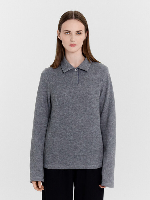 Поло выполнено из трикотажного полотна интерлок. Поло прямого силуэта. Воротник стояче-отложной. Шов втачивания воротника закрыт бейкой из кулирки. Горловина с застежкой поло (на пуговицу на ножке D10мм). Рукава втачные, длинные. Нижний срез поло и рукавов обработан швом вподгибку на 2х игольной плоскошовной машине.