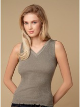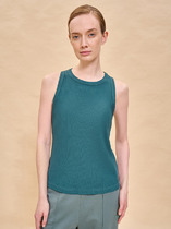 Женская майка в рубчик из трикотажа кашкорсе с округлым вырезом горловины  и открытыми проймами.  Горловина и проймы окантованы.