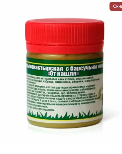 Барсучий жир, мёд натуральный кавказский, воск пчелиный, масляные экстракты душицы, чабреца, лимонника, ежевики, мяты перечной, мяты луговой, камфора.