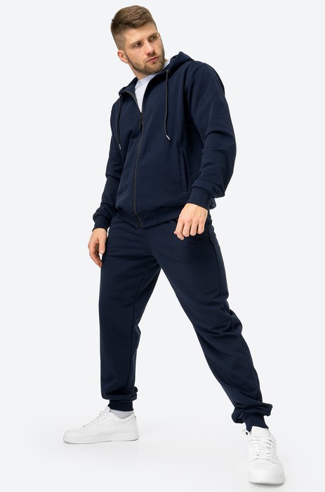 Натуральный хлопковый трикотаж хорошо пропускает воздух. Однотонный темно-синий костюм подойдет на каждый день. Трикотажный костюм со штанами гармонично вписывается в уличный стиль и пригодится мужчинам во время занятий спортом.