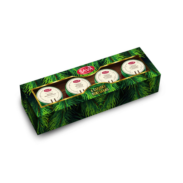 Набор состоит из четырех баночек необычных сибирских лакомств, на крышке которых собраны приятные пожелания.