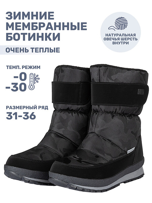 Зимние мембранные сапоги NIKASTYLE СОФТ БУТС с температурным режимом до -30°С.Водонепроницаемый верх со вставками из экокожи обеспечивает сухость и комфорт стопы. Благодаря микроскопическим порам мембраны обувь «дышит» и не пропускает внутрь влагу.Меховая подкладка на основе овечьей шерсти с меховой съемной 3-х слойной стелькой (шерсть+фольга+войлок) и специальной петлей для удобства вынимания.Легкие теплые сапоги с прочным увеличенным мыском и задником для активных прогулок детей и подростков.Подошва с протектором выполнена из термопластичной резины (TPR), обладает высокой износостойкостью и хорошей амортизацией, уменьшая нагрузку на ноги.За счет застежек на липучке легко регулировать полноту стопы, а также удобно обувать и снимать сапоги.Наличие светоотражающих элементов для безопасности ребенка в темное время суток.Чтобы правильно подобрать размер рекомендуем вынуть стельку и приложить к ней ногу ребенка - длина стельки должна быть примерно на 1-1,5 см больше, чем длина стопы.Сушите обувь при комнатной температуре или с помощью электросушилки. Съемные стельки можно сушить на батарее, вынимайте их за специальную петельку.
