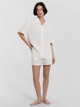 Сорочка женская из трикотажного полотна «кашкорсе» с набивным рисунком, слегка расширенная книзу, без рукавов, на широких бретелях, с горловиной V-образной формы и небольшой драпировкой в центре груди. Горловина спинки и переда окантованы основным материалом и украшены декоративной строчкой «кроше». Проймы окантованы основным материалом, низ изделия обработан узкой обметочной строчкой, создающей красивый волнистый край.