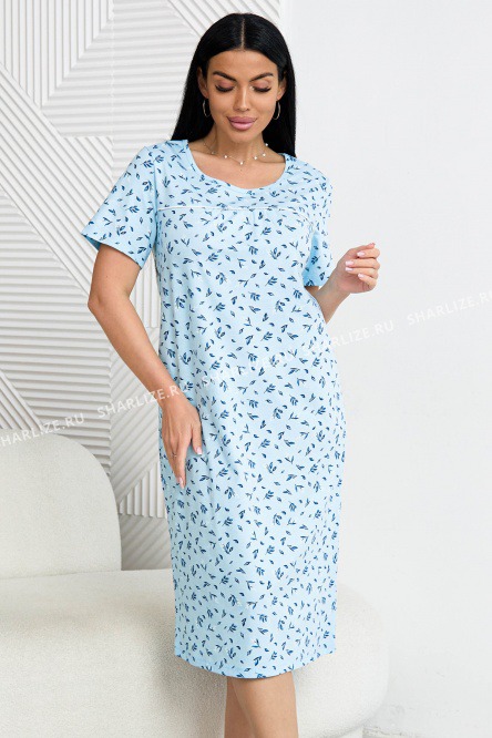 Ночная сорочка из трикотажного хлопкового полотна, голубого оттенка с изысканными цветочными мотивами.Модель на кокетке, круглая горловина украшена маленьким атласным бантом.Изделие свободного кроя с коротким рукавом, формирует прямой силуэт, слегка расширяясь к нижней части.