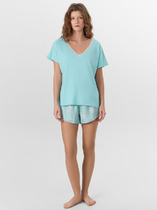 Сорочка молодежная из гладкокрашеного трикотажного вискозного полотна, на узких бретелях из окантовки, слегка расширенная книзу, с лифом «бюстье», отделанным кружевом по вырезу горловины и соединенным с основной деталью переда кружевной вставкой. Чашечки лифа присборены по нижним срезам и образуют спереди запах. Спинка - с кружевной деталью треугольной формы, соединенной с бретелями в вершине угла посредством пластмассового кольца. Для регулирования длины бретелей предусмотрены пластмассовые регуляторы. Верхний срез спинки и проймы окантованы основным материалом.