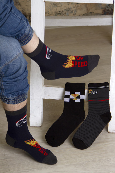 Набор высоких мужских носков с вывязанными рисунками в спортивном стиле. В упаковке 6 пар - по 2 пары каждой расцветки