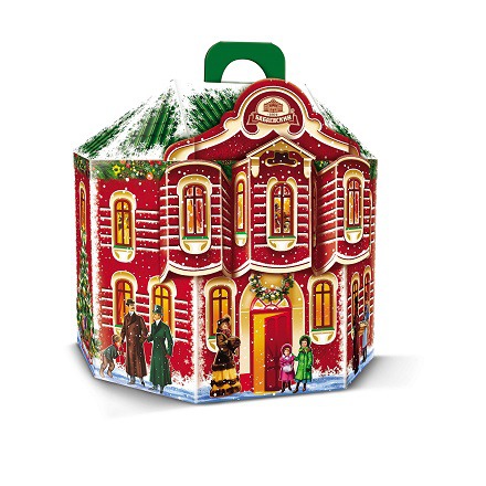 Картонная коробка, стилизованная под историческое здание Бабаевской фабрики, внутри – ассорти шоколадных и карамельных конфет, производства концерна «Бабаевский».