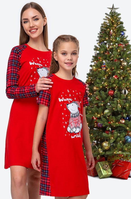 Детская новогодняя сорочка для девочки и девочки-подростка создана для уютного вечера на каникулах. Красная сорочка с короткими рукавами выполнена из натурального 100% хлопка. Ночная сорочка с принтом Мишка и с рисунком в клетку на рукавах и спинке — отличный подарок на Новый год и Рождество.