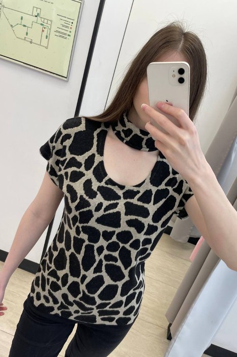 Джемпер свободного силуэта из эластичного полотна с жаккардовым анималистичным узором. Цельнокроеный короткий рукав. Оригинальный вырез горловины оформлен воротником-стойкой.