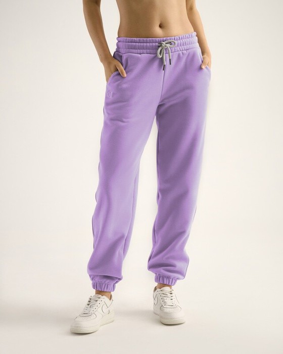 Джоггеры свободного кроя с боковыми карманами, собранные внизу. Широкий эластичный пояс со шнуром.