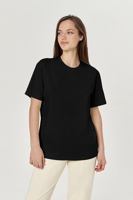 Boyfriend крой, круглый вырез. Втачной рукав. Горловина из рибаны. отстрочена по переду. Плечевые швы и шов горловины спинки укреплены бейкой из основной ткани.