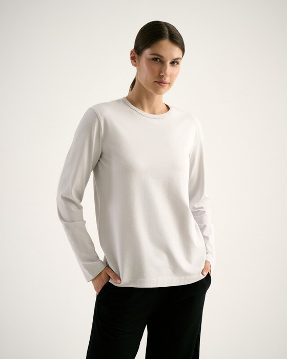 Лонгслив женский свободного силуэта. Втачной длинный рукав. Горовина окантована бейкой из основной ткани.