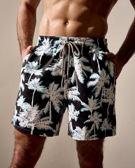 Плавательные шорты. Карманы в боковых швах. Задний карман с клапаном на правой задней половинке шорт. Пояс цельнокроенный, отстроченный, внутри с резинкой и шнурком.