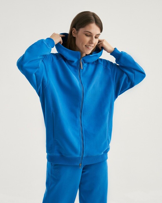 Толстовка на молнии, с отрезными кокетками. Двойной капюшон. Рукав втачной с вытачками по переднему шву. В рельефах переда карманы в шве. Манжеты и пояс из кашкорсе.