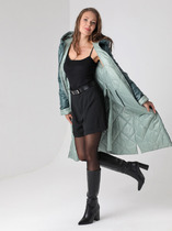 Утепленное пальто от бренда D'imma fashion studio, выполненное из гладкого матового материала со вставками из эко-кожи, на шелковистой подкладке с именным логотипом бренда. Для утепления использован наполнитель термМакс, рассчитанный на температуру до -30 градусов. Пальто полуприлегающего силуэта, с капюшоном с отделкой из искусственного меха, спереди застегивается на скрытую молнию и пуговицы на петлях, по бокам карманы на молнии.