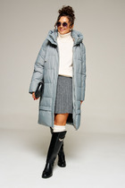пальто женское с центральной застёжкой на кнопки. Линия плеча спущенная, рукав втачной одношовный с кулисой по низу. По переду прорезные карманы с листочкой с втачными краями. Капюшон цельнокроенный с центральной частью. В качестве отделки испоьзуются детали. Варежки съёмные манишка с центральной с центральной застёжкой на тесьму-молнию(втачная деталь).