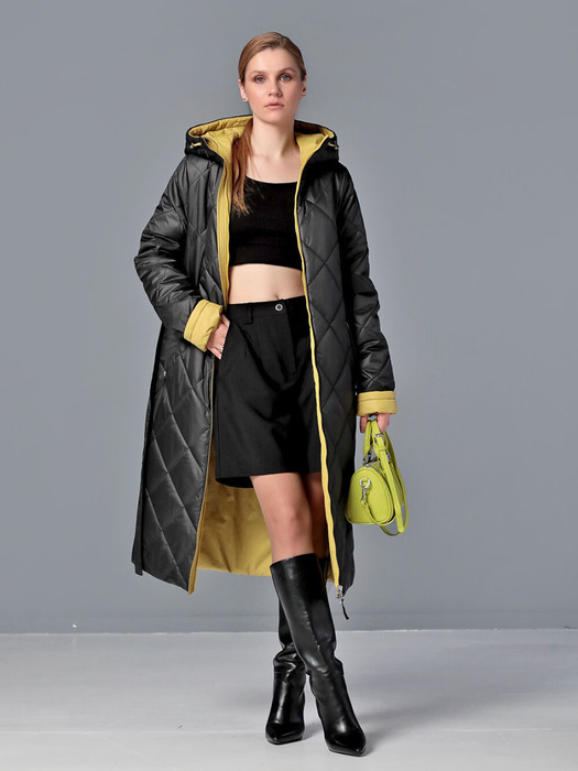 Стильное двухстороннее пальто прямого силуэта с застежкой на двухзамковую молнию,  которая позволяет расстегнуть пальто как сверху, так и снизу, регулируя тем самым ширину шага по необходимости. Воротник - стойка, переходящая в регулируемый капюшон. В варианте "стеганого" верха прорезные карманы застегиваются на молнию, в случае "гладкой" стороны -  карманы накладные. При желании линию талии можно подчеркнуть съемным поясом. Длина втачного рукава корректируется отворотом. Модель такого демисезонного пальто подходит для девушек и женщин разной возрастной категории, оно хорошо садится на любую фигуру. Плащевая ткань, из которой выполнено пальто, имеет водоотталкивающую пропитку, выдерживающую небольшой  дождь, снег и ветер. Хорошо зарекомендовавший себя утеплитель "Холлофайбер", плотностью 250гр/м, защитит от холода. Выбирайте понравившееся сочетание цветов, меняйте аксессуары и обувь, и это пальто станет любимой вещью в Вашем гардеробе! Пусть осень будет не только комфортной, но и стильной!