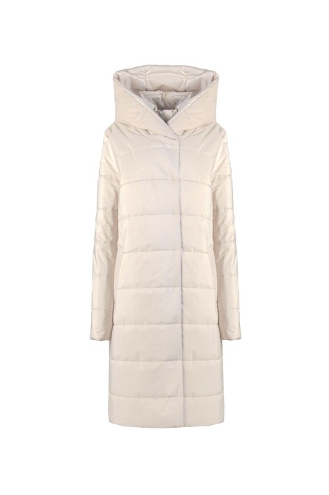 Пальто женское плащевое утепленное прямого силуэта, двубортное, длиной ниже колена, на подкладке. Застежка на пробивные потайные кнопки. Перед c карманами листочка, застегивающимися на потайную кнопку. Рукав длинный, двухшовный. Пальто с капюшоном и «манишкой» с застежкой на молнии, из плащевой ткани, стеганой на утеплителе ISOSOFT 200г.