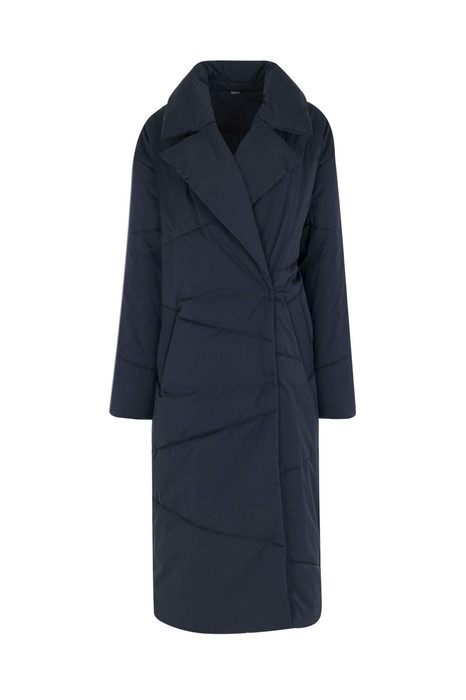 Пальто женское плащевое, утепленное, длиной ниже колена, стеганое на утеплителе. Двубортное, с застежкой на две пришивные кнопки и полодержатель. По переду карманы- листочка с втачными концами. Рукав втачной. Воротник и лацканы отложные.