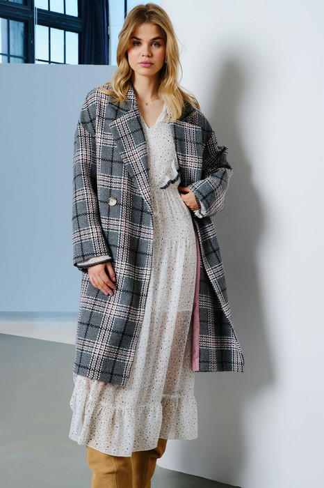 Пальто свободного кроя в стиле оверсайз, на подкладке. Воротник пиджачного типа с отложным воротником и лацканом, застёжка двубортная на петли и пуговицы, в боковых швах прорезные карманы. По спинке средний шов, переходящий в отлетную шлицу. Пальто выполнено из нежнейшего, хорошо драпирующегося полотна с содержанием шерсти, которое не сковывает движения, и в нём чувствуешь себя максимально комфортно.