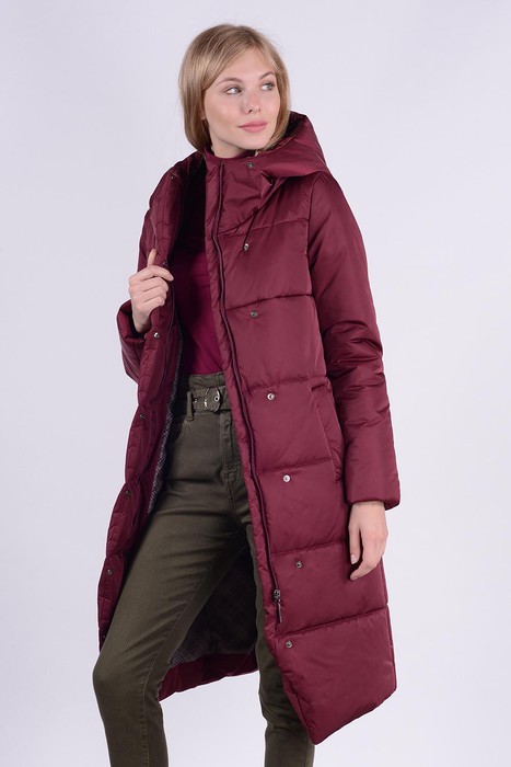 Стильное зимнее женское полупальто с застежкой на молнию и воротником, переходящим в капюшон. Силуэт прямой, линия низа фигурная.Удобные прорезные карманы с листочкой. Модель выполнена из нового вида ткани с умеренной плотностью , которая хорошо держит форму, износоустойчива и неприхотлива в чистке.Для защиты от ветра и мороза рукава по низу дополнены внутренними трикотажными манжетами.В изделии использована система утепления Air Twin (от 0 °С до -20 °С). Длина пальто по спинке ок.103см. Длина рукава  ок.65 см. Рост 170 см Состав: полиэстер - 100%, утеплитель: Air Twin 200 г/m 2 Цвет: бордо Цвет одежды на фото может незначительно отличаться от оригинала.