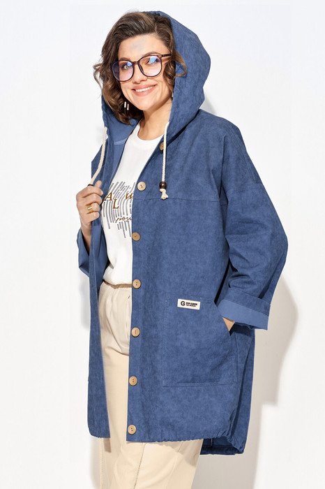 Женская джинсовая парка-ветровка, выполнена из 100% хлопка с эффектом водоотталкивающей пропитки. Удлиненная джин совка силуэта оверсайз очень практична и удобна, смотрится необычно и элегантно.  Модель с объемным капюшоном является очень популярной в предстоящем сезоне. Застежка центральная на петли и пуговицы. Рукав длинный на спущенном плечевом поясе обеспечивает идеальную посадку по фигуре. По полочке расположена кокетка и накладные карманы с отделочными строчками.  Спинка с центральным швом, переходящим в разрез. Низ изделия фигурный с утяжкой на шнуровку с наконечниками.