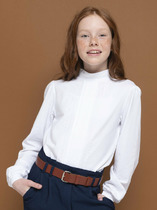Классика, которая запомнится. Белая рубашка полуприлегающего силуэта имеет яркие акцентные вставки в виде тесьмы на манжетах и съемного декоративного банта под горловиной. Необычное прочтение воротника-стойки с аккуратно-заложенными рюшами удачно дополнено оригинальными лучами-вытачками. Актуальный образ можно сочетать с любым элементом костюма. Изделие подчеркнет характер молодой модницы и избавит мам от головной боли за школьный гардероб.