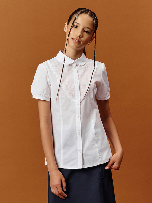 Нестандартная классика для любительниц быть в центре внимания. Эта рубашка приятно удивляет своими нетривиальными формами. Фигурный кружевной декор буквально приковывает взгляды, а съемный бант из темно-синей репсовой тесьмы с декором из жемчуга и страз добавляет образу роскоши и аристократизма. Ну какая модница откажется носить гордое звание иконы стиля?