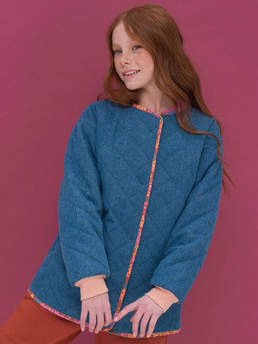 Джинсовый двусторонний бомбер прямого мягкого силуэта-оверсайз для девочек. С одной стороны стеганая ромбами джинсовая ткань с синтепоном, с другой - искусственный тедди мех "барашек". Застежка на кнопки - удобно ребенку любого возраста. Со стороны меха отделка из курточной ткани в цветочный принт. Карманы наклонные с листочкой - не порвутся и удобно пользоваться. Широкие рукава на манжете из рибаны - тепло и можно брать на вырост. Такая весенняя куртка органично подстраивается под любой вариант низа: классический, кэжуал, спортивный. Можно носить с юбками и брюками.