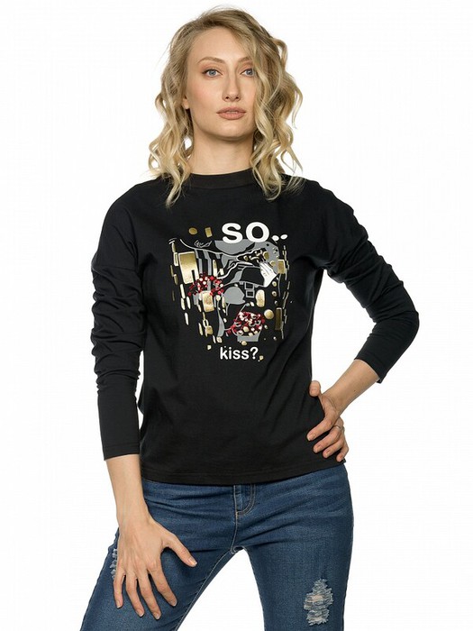 Новинка! Джемпер женский свободного объема со спущенной линией плеча, горловиной из рибаны, стойким эластичным принтом с элементами золота, в стиле картины Климта и вышивкой деликатными красными пайетками-монисто. Перевод Итак... поцелуй?