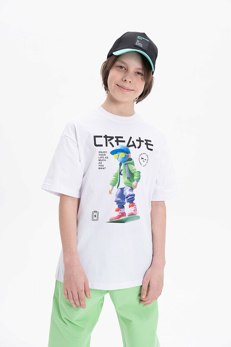 Футболка для мальчика свободного кроя - это идеальный выбор для активного ребенка. Вырез горловины обработан эластичной тканью — она прекрасно держит форму, не растягивается, при этом ребёнку удобно надевать и снимать футболку. Футболка летняя с принтом по переду и надписями в японском стиле. Перевод надписей: "create" - создавай, "enjoy your life as much as you want" - наслаждайся жизнью столько, сколько хочется. Яркая спортивная футболка подходит как для подростков так и для малышей в детский сад. Подходит для любого времени года.
