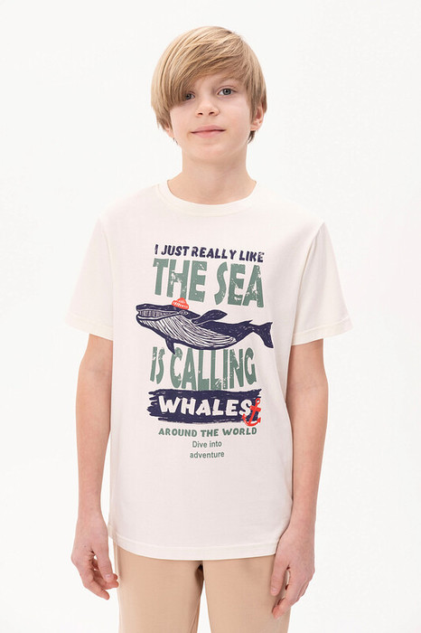 Футболка для мальчика прямого кроя - это идеальный выбор для активного ребенка. Вырез горловины обработан эластичной тканью — она прекрасно держит форму, не растягивается, при этом ребёнку удобно надевать и снимать футболку. По переду принт в морском стиле с надписью. Перевод надписи "I just really like the sea is calling" - мне просто очень нравится что море зовёт, "whales around the world" - киты по всему миру, "dive into adventure" - погрузись в приключение. Спортивная футболка подходит как для подростков так и для малышей в детский сад. Подходит для любого времени года.