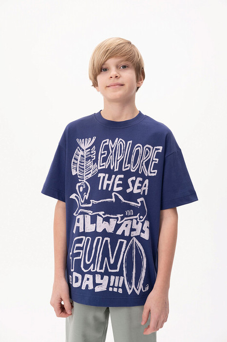 Футболка для мальчика свободного кроя - это идеальный выбор для активного ребенка. Вырез горловины обработан эластичной тканью — она прекрасно держит форму, не растягивается, при этом ребёнку удобно надевать и снимать футболку.По переду принт с надписями. Перевод принта "explore the sea" - исследуйте море, "always fun day" - всегда весело. Спортивная футболка подходит как для малышей в детский сад так и для подростков. Она подходит для любого времени года, её можно носить как летом, так и в холодное время года в качестве среднего слоя одежды. Помните о правильном уходе за изделием: рекомендуется стирать при температуре не выше 30 °C, без предварительного замачивания, с изнанки. Это поможет сохранить качество и цвет футболки на длительное время.