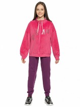 Комплект для девочек. Худи из футера оверсайз силуэта. Капюшон изнутри отделан декоративной тесьмой с вытканным рисунком, перевод Рождество. Линия плеча спущена, манжеты по низу рукавов и изделия из основной ткани. Rubber принт с золотом и глиттером. Перевод Волшебное Рождество. Брюки из футера умеренного объема с манжетами и поясом из основной ткани, карманы в боковых швах.