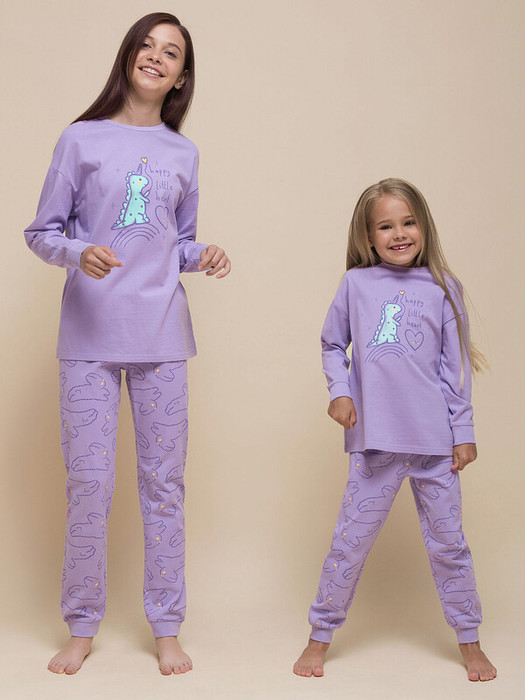 Красивая и уютная пижама супертрендового сиреневого цвета для девочки. В составе ткани 100% хлопка — идеально для детской одежды! Модель приятна на ощупь, прекрасно пропускает воздух, позволяя коже ребёнка дышать. При этом в пижаме из хлопка ребёнку будет комфортно, даже если он сбросит одеяло во сне. Всё это обеспечивает комфортный и качественный сон. Джемпер и брюки среднего объёма, плечо немного спущено, рукава широкие и свободные — в пижаме очень удобно спать, играть. Широкая и мягкая резинка в поясе не перекручивается и не давит. Манжеты и отделка горловины из эластичной рибаны — они не растягиваются, ребёнку удобно надевать и снимать пижаму. Брюки украшает принт в виде милых зверят, а джемпер декорирован принтом в виде дракончика-единорога — ни одна девочка не останется равнодушной! Перевод: "Счастливое маленькое сердечко". Комплект подходит для сна как дома, так и в детском саду — прекрасный выбор для вашего ребёнка! Станет замечательным подарком, который способен вызвать искреннюю радо