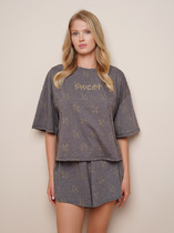 Женский костюм – майка и шорты из эластичной ткани в рубчик. Ткань отлично растягивается и быстро возвращается в исходную форму, приятна на ощупь и проста в уходе. Майка на широких бретелях свободного кроя с увеличенными проймами – стильная, спортивная, уютная. Обтягивающие короткие шорты на мягкой резинке из основной ткани – отлично сидят, акцентируют внимание на ногах. В костюме удобно спать, заниматься повседневными делами и просто быть собой.