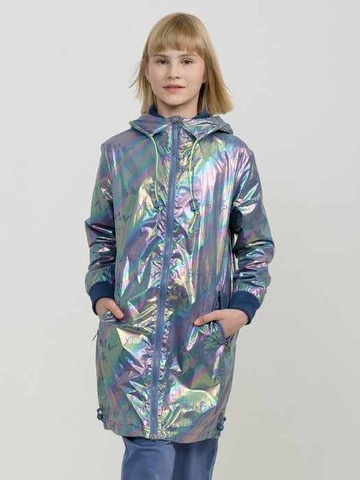 Плащ на тонком подкладе. Рекомендуемый температурный режим не ниже плюс 10 градусов. Ткань с голографическим водоотталкивающим покрытием. Прямой силуэт с регулировкой понизу эластиком со стоппером. Внутренний воротник и манжеты рукавов из рибаны. Оригинальная конструкция капюшона вместо классической утяжки по краю капюшона на шнур с фиксатором спроектирована специальная деталь держатель для декоративной тесьмы, которая регулирует объем капюшона по внешнему краю двойным эластиком с прозрачным наконечником. Световозвращающие элементы в боковых швах.